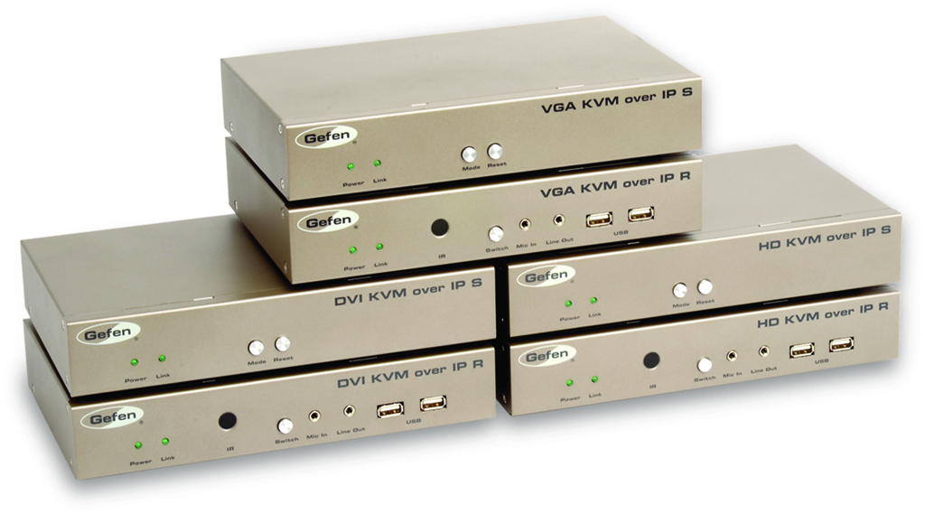 Los extensores KVM HDMI sobre IP, KVM DVI sobre IP y KVM VGA sobre IP ofrecen una manera efectiva de extender los periféricos a través de cable CAT-5 para acceder a vídeo por ordenador, audio y control desde cualquier sitio dentro de la LAN. La resolución de vídeo de alta definición de hasta 1080p es soportada usando el mismo cable CAT-5 con el beneficio adicional de enviar dos canales de audio, Prohibited / salida de micrófono, USB, RS-232 e IR.