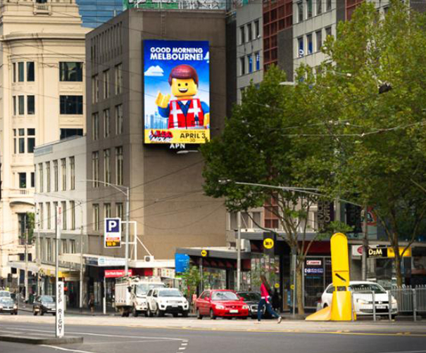 For the launch of the movie 'The Lego Movie', OMD y Village Roadshow hicieron uso de las pantallas de gran formato que APN Outdoor tiene localizadas en las ciudades de Melbourne, Sydney y Brisbane.