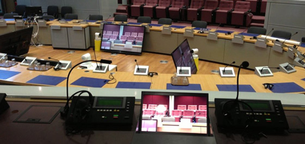 La interpretación simultánea requiere salones especialmente equipados con cabinas a prueba de ruidos para los intérpretes y un equipo electrónico que facilite su tarea. Este es el caso de la sala de reuniones de la Comisión Europea que precisaba de un monitor no invasivo que les permitiera visualizar tanto las personas en las salas como los documentos.