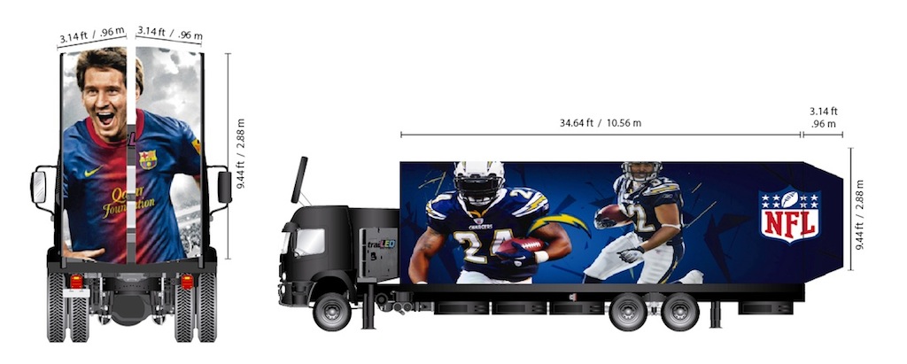 Denominada TraiLED, esta megapantalla se forma con las pantallas independientes ubicadas en los laterales y la parte trasera del camión, que al desplegarse mediante un sistema hidráulico componen un gran display LED de 70 metros cuadrados que puede utilizarse en cualquier entorno al aire libre.