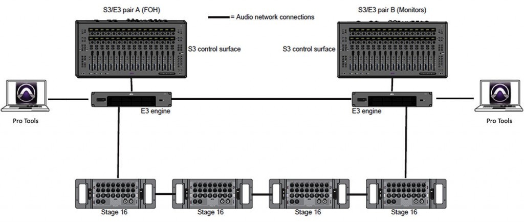 Varios sistemas S3L pueden ahora trabajar conectados en red, con sus respectivos operadores, y todos ellos pueden compartir los racks remotos de entradas y salidas Stage16, con ajustes de ganancia independientes para cada sistema. Concretely, los cambios de ganancia realizados por un técnico no afectan a otros técnicos (FOH y monitores, For example), aunque estén trabajando sobre los mismos previos compartidos.