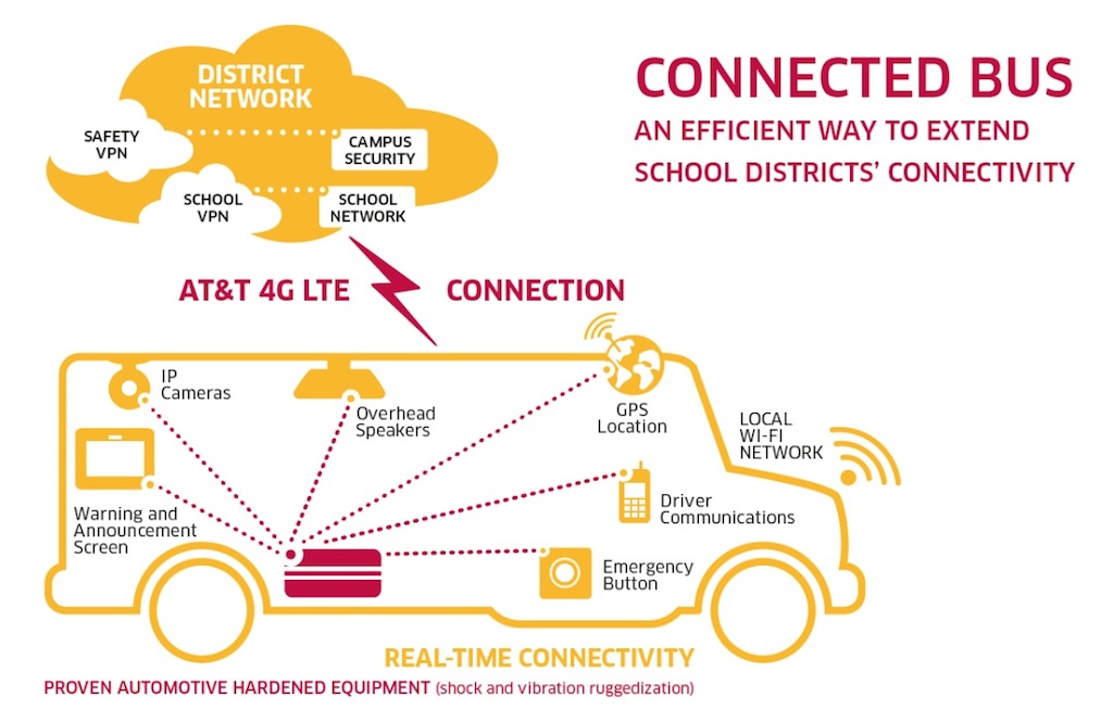 El ‘Bus conectado’ soporta varias tecnologías que se utilizan en la educación norteamericana, tales como la red inalámbrica 4G LTE de AT&T y dispositivos para aumentar el acceso de los estudiantes y profesores a la información. Diseñado utilizarse en movimiento durante las rutas escolares, esta solución ofrece nuevas opciones para que los distritos académicos puedan extender el aprendizaje escolar a partir del momento en que los estudiantes suben al autobús y en todo el camino a casa.