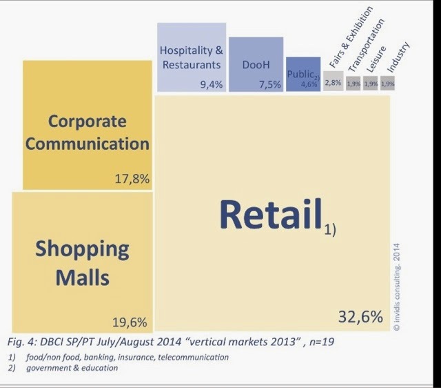 Esta tendencia positiva se debe, según el análisis de la muestra, al incremento del flujo de caja de las empresas dentro de su estrategia de presupuestos, de los que dependen los proyectos de digital signage (hardware, software, services,…), principalmente en los entornos de retail y centros comerciales como los dos mercados verticales más importantes en España y Portugal en la adopción de esta tecnología.