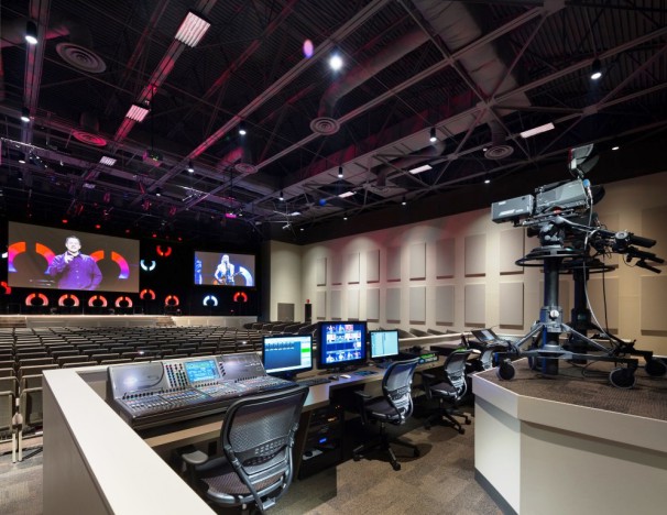In the construction of the Sugarloaf campus, 12Stone Church worked with Blue Hat Design to create video production facilities that include an auditorium of 1.000 seating, a control room and 250 seats that make up the Williams Auditorium.
