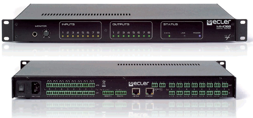 Mimo88 es una matriz digital de audio de 8 tickets and 8 Departures, totalmente programable y enlazable a una segunda unidad con lo que se obtiene una matriz de 16 tickets and 16 Departures, con enrutamiento real desde cualquier entrada hacia cualquier salida.