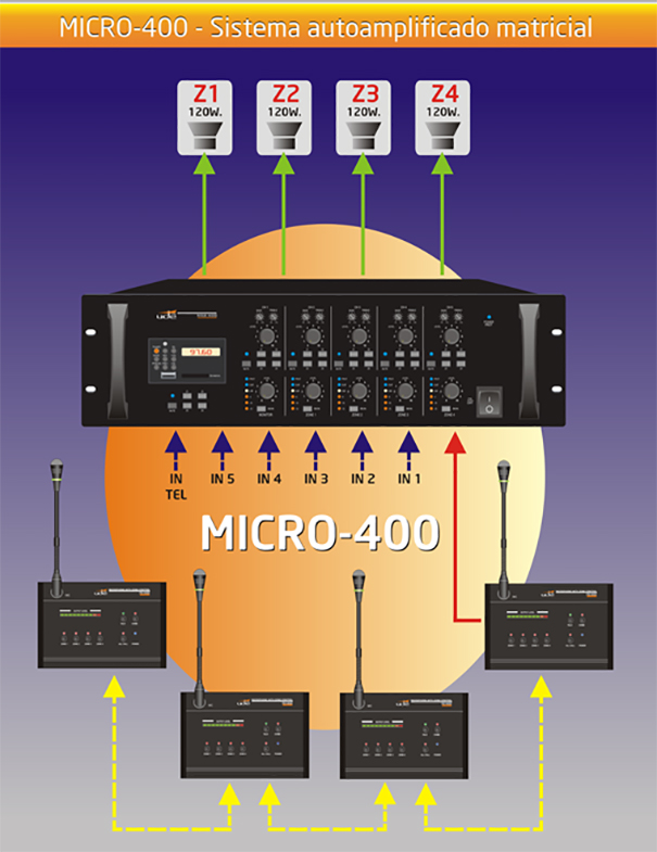 Se trata de una solución pensada para instalaciones de potencia media que ofrece amplificador interno de 120W para cada salida y la posibilidad de conectar otro amplificador para mayores potencias. También dispone de reproductor MP3 interno mediante soporte USB y SD, radio y entrada telefónica.