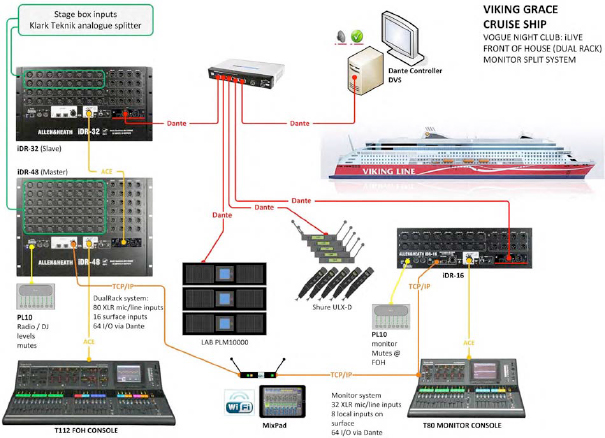 in the night club, restaurants and the different conference rooms with which the ship is equipped, iLive systems have been installed, which distributes in Spain Reads, iLive-T112 and iLive-T80 control surface composites with iDR-48 MixRacks, iDR-32 and iDR-16 equipped with optional Dante network cards, and a total of seven MixWizard WZ16 rack-mount mixers:2.