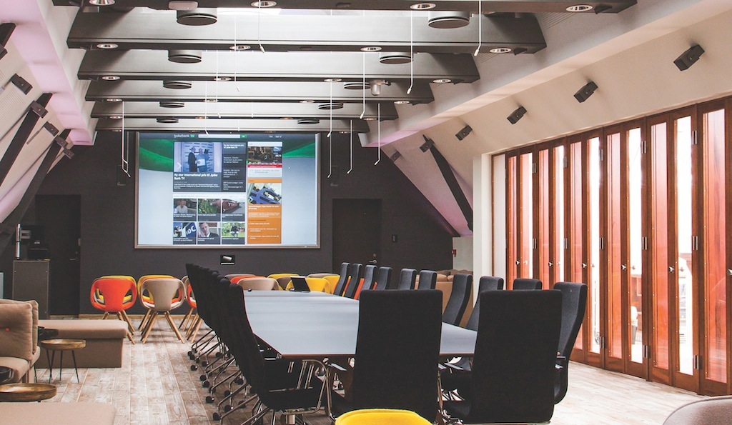 Así lo explica Steen Mertz, director TIC de Jyske Bank: “sabíamos que la habitación en sí era ya un desafío, ya que es larga y estrecha, con un techo bajo acristalado y mucha luz natural procedente de esta gran ventana y de las claraboyas, lo que suponía un reto añadido para la instalación de un sistema visual de alta calidad, fácil de utilizar y que armonizara con el diseño interior de la sala, tal y como queríamos”.