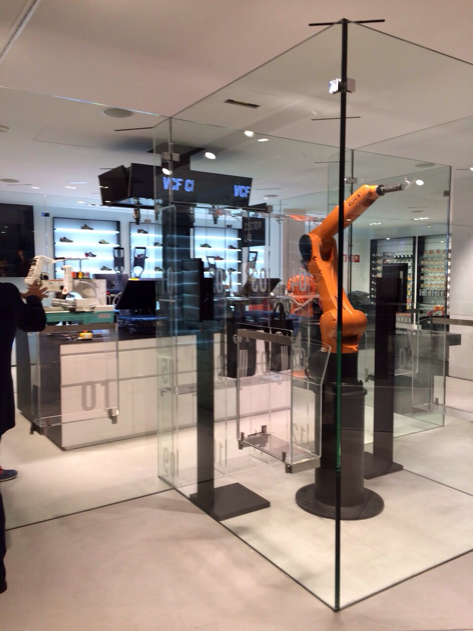 But without a doubt, the most innovative and surprising element is Kuka, a robotic arm that delivers personalized clothing from the Custom Lab. Kuka places the bag with the purchase in the chosen box, once the customer enters their ticket code. Y, while customers wait for their orders, entertains the audience by dancing.