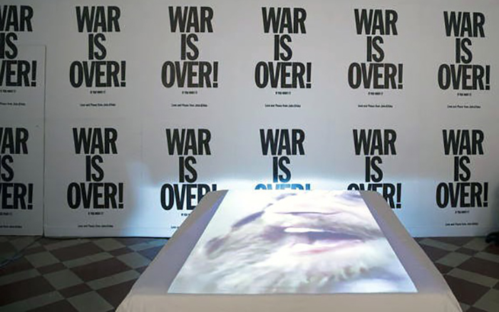 Como cierre de la muestra, y recreando la puesta en escena de la mítica suite 1742, se ha creado un mural de grandes dimensiones, decorado con eslóganes antibelicistas (War is Over), frente al que se ubica una gran cama.