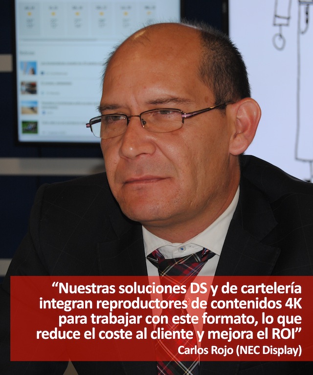 El experto de NEC Display, Carlos Rojo, va más allá y subraya que “cada vez hay una motivación mayor por generar nuevos contenidos, y si es con la máxima definición mejor. También es cierto que cuando hablamos de la adopción de nuevas tecnologías, como 4K, casi siempre pensamos en grandes clientes y no en una pyme que quiera una o dos pantallas con contenidos creativos para impactar en sus clientes. Y este es un problema que se da tanto en hardware como en generación de contenidos”.