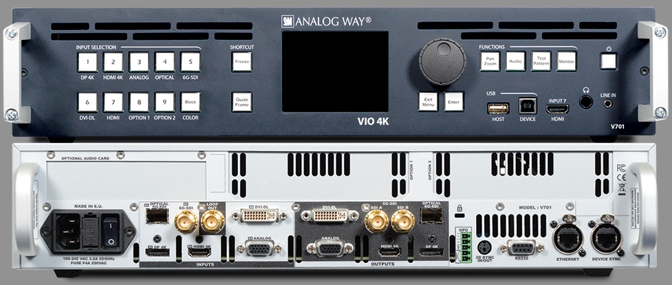 El nuevo conversor multiformato de Analog Way, denominado VIO 4K cuenta con siete entradas para facilitar la conversión de multitud de señales, incluidas DVI Dual-link, DisplayPort, HDMI, 6G-SDI óptico y analógicas universales, con una formatos de salida de hasta 4K-30Hz ó 4K 60Hz con tarjeta opcional de actualización.