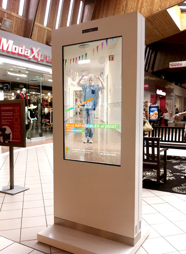La señalización digital es un gran medio para divulgar mensajes y conseguir que lleguen a un amplio número de persona. Con objeto de que la campaña contará con la máxima cobertura, more than 60 shopping centers, que tienen instalados unos 700 soportes de digital signage, han servido para difundir los objetivos marcados por la Fundación José Carrerras.
