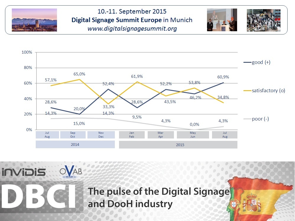 El último estudio del clima de negocios de la industria de digital signage en España y Portugal de DBCI o Índice OVAB Europa, incide en que esta industria mantiene su crecimiento en positivo en los meses de mayo a julio de 2015, con un incremento en 5,40 points, manteniendo las previsiones optimistas para el sector.