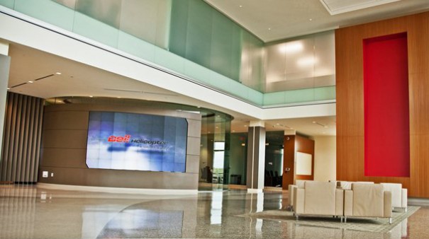 Bell Helicopter ha elegido los módulos omniSHAPES de eyevis para configurar el videowall convexo de 8,4 metros cuadrados que ha instalado en el vestíbulo de su recién remodelada sede en Fort Worth.