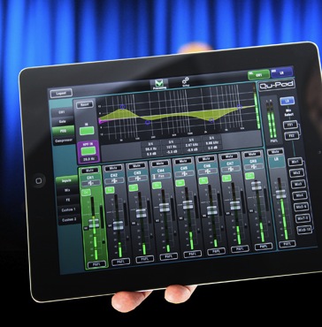La app Qu-Pad para iPad brinda control inalámbrico instantáneo de la mezcla y otros parámetros, permitiendo al usuario moverse libremente por el lugar del evento.