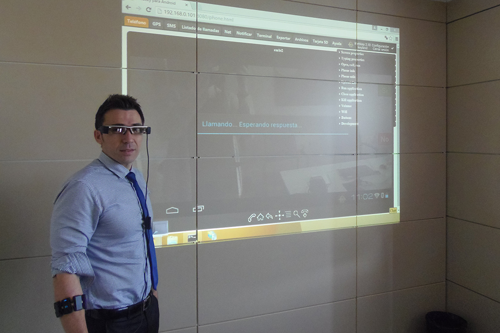 A través de las gafas se recibe la información visual mientras que, gracias al brazo electrónico, el usuario puede interactuar con esa información. In this way, se consigue una comunicación bidireccional y una total inmersión en el sistema virtual. El operador puede interactuar con el menú visual de la pantalla virtual proyectado sobre las Smartglasses, y pulsar botones, abrir, cerrar o mover elementos, al tiempo que mantiene el contacto con el mundo real.