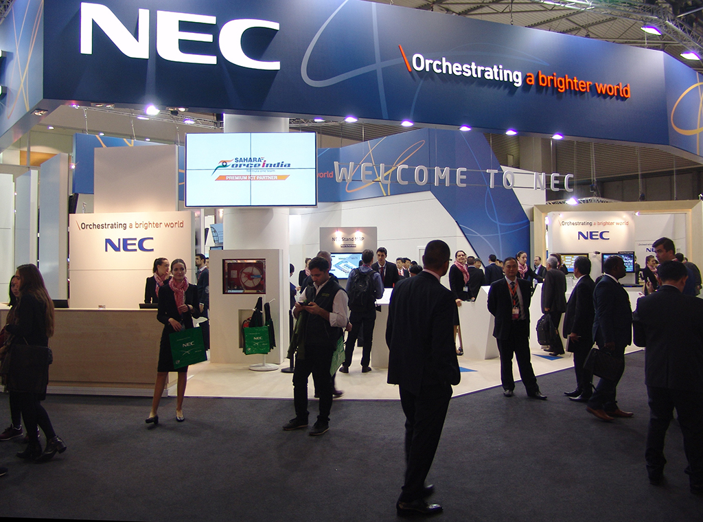 Con un estilo tradicional, donde se reforzaba la imagen de marca, el stand de NEC Corporatión en el MWC 2016 contó con la participación de Eikonos para su montaje y dotarlo de atractivas soluciones audiovisuales que atraían la atención del público.