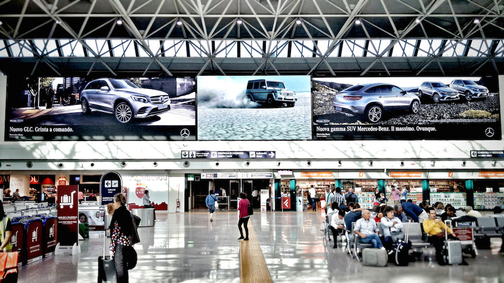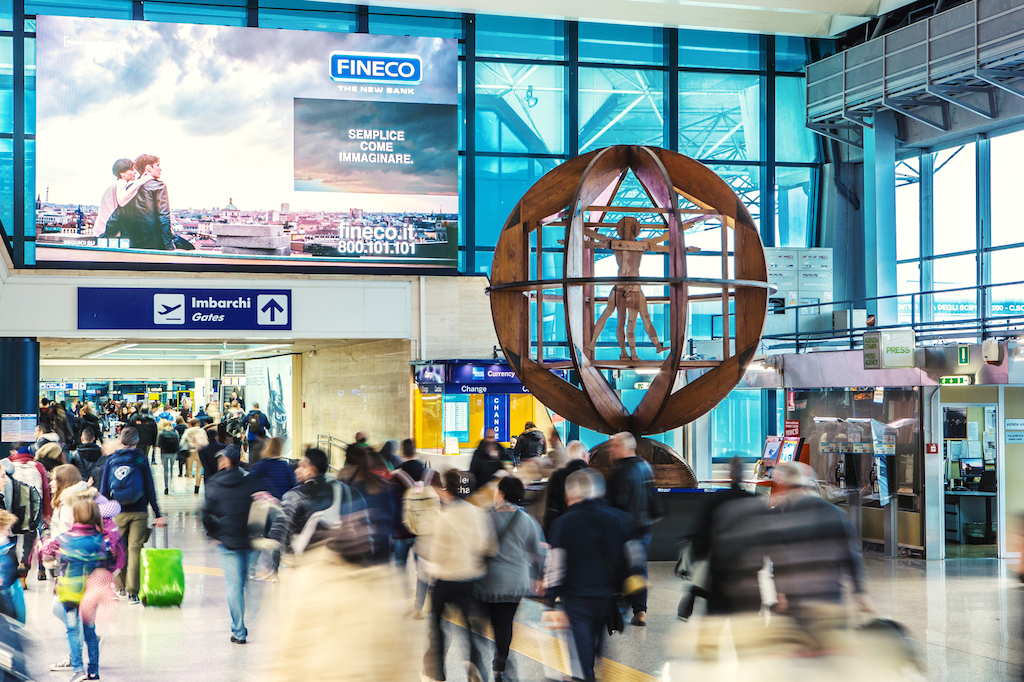 Con cuarenta millones de pasajeros que pasaron en 2015 por sus terminales, el aeropuerto Fiumicino de Roma es también el más grande de Italia y uno de los más activos en Europa. Para mejorar las expectativas de ingresos publicitarios, los gestores Aeroporti di Roma (ADR) seleccionaron a la empresa de publicidad digital Clear Channel Italia para transformar el programa de publicidad en todas las áreas y terminales de esta instalación.