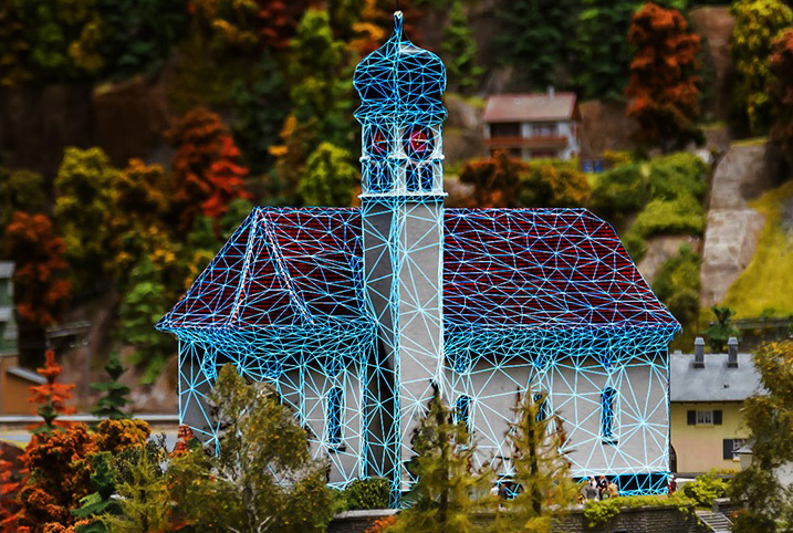 Projection technology allows you to show the landscape and make very subtle changes to the miniature buildings that the trains pass by.: the landscape changes from day to night, and the same does the recreated environment and the houses, office blocks, churches or sports venues. A loop of about twenty minutes simulates day and night scenes and all types of weather conditions, culminating in a two-minute mapping show.