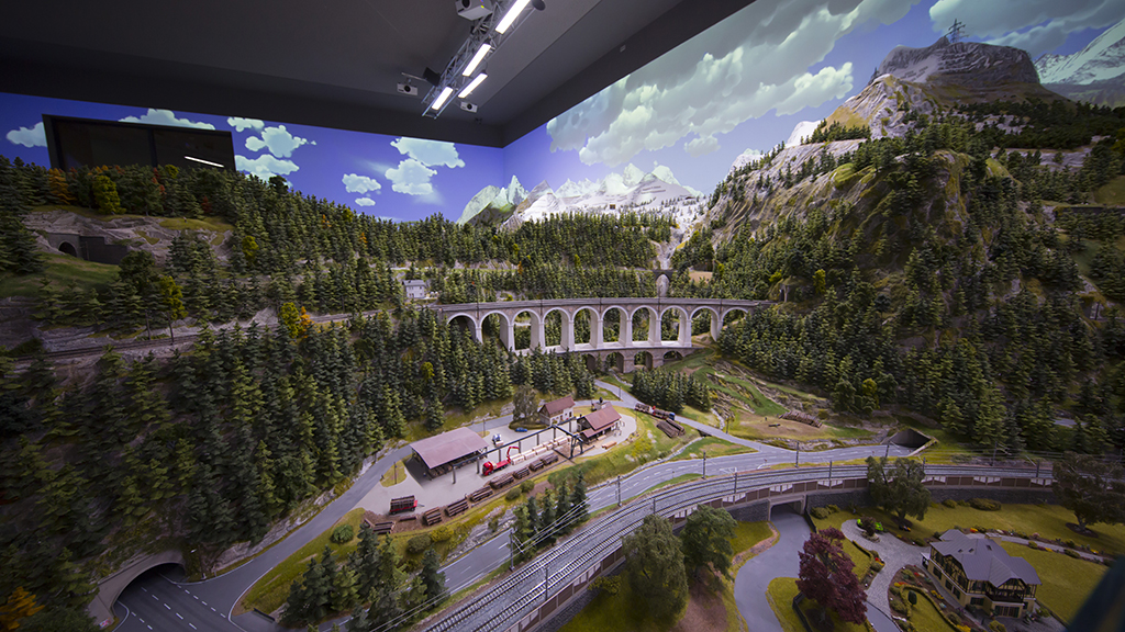 For the model of 400 m² that occupies the heart of the TraumWerk, more than a hundred trains travel through a traditional Alpine landscape populated by miniatures of people, buildings and landscape elements, that come to life thanks to the projection of images.