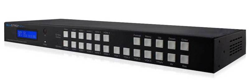 El nuevo escalador MFP112 de Blustream, available in the Spanish market through BVT, cuenta con un total de once entradas: una de vídeo compuesto y otra de vídeo por componentes, cuatro VGA, cuatro HDMI y una de HDBaseT, y salida HDMI y otra en HDBaseT.