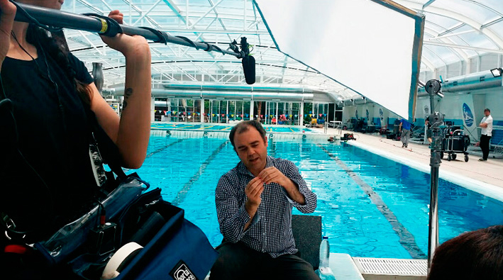 El escenario elegido para realizar el experimento ha sido la piscina olímpica del Real Club Canoe en Madrid que se ha convertido en un plató dotado con la última tecnología audiovisual y digital: a computer, varios sensores de visión externa y subacuática, dos cámaras, una de ellas subacuática.