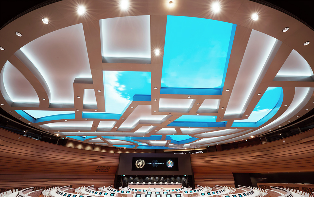 La Sala de los Emiratos, también conocida como Sala XVII, del Palacio de las Naciones Unidas (HIM) en Ginebra cuenta con la tecnología de visualización Led de Leyard para presidir las sesiones que se celebran diariamente.