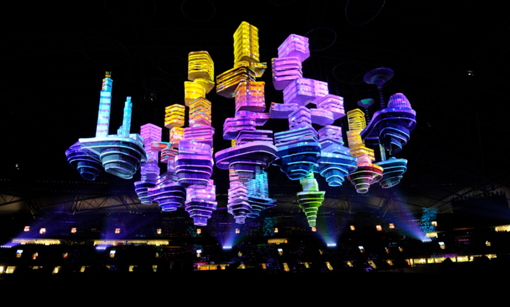 Finally, esta roca gigante “se dividió en ocho piezas que se desplazaron en varias direcciones -continua este directivo-, mientras que la ciudad flotante 3D (compuesta de quince gigantescos módulos plegables de tela, con un tamaño total de 60 meters in diameter and 20 tall) se elevó desde el escenario hasta alcanzar una altura de 35 metros, coincidiendo con el final del desfile”.