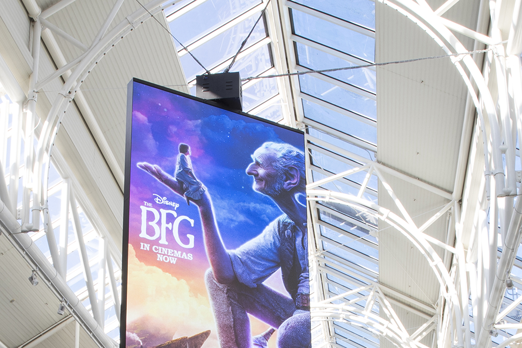 Con objeto de atraer la atención del visitante y disponer de un soporte donde las marcas pudieran promocionar sus productos, el centro decidió instalar una pantalla de gran formato que estuviera suspendida del techo. Esto presentaba un desafío al que se tuvo que enfrentar la empresa responsable del proyecto, The GPT Group.