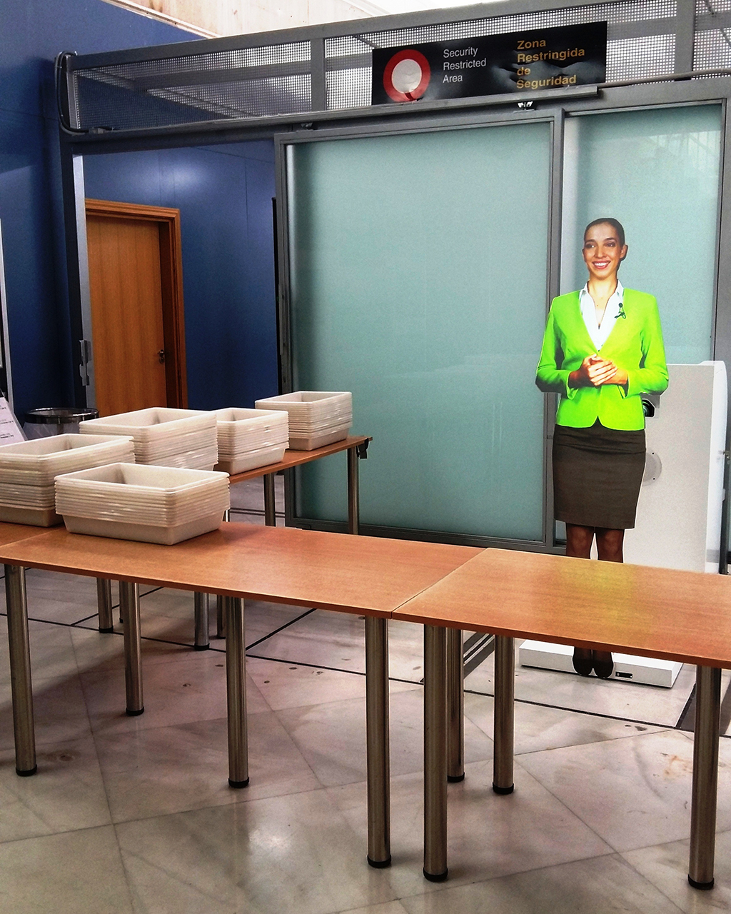 Esta es la segunda implementación que realiza Aena, tras la del aeropuerto de Mallorca. Este holograma de mujer está ubicado en el acceso de los filtros y emite diferentes mensajes e instrucciones para pasar el control de seguridad, como puede ser la normativa del transporte de líquidos en el equipaje de mano y el proceder del viajero.