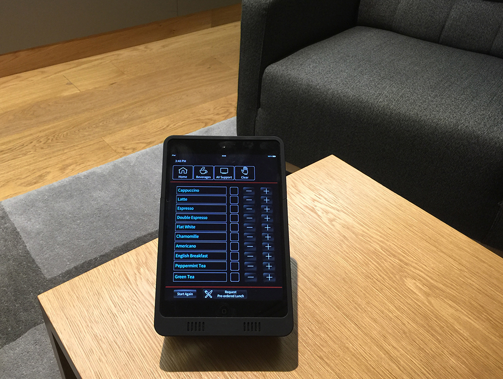 Guests can use TIO to order refreshments with Crestron's touchscreen system on an iPad, before or during meetings. Orders are sent directly to the kitchen, where staff receive an auditory and visual alert.