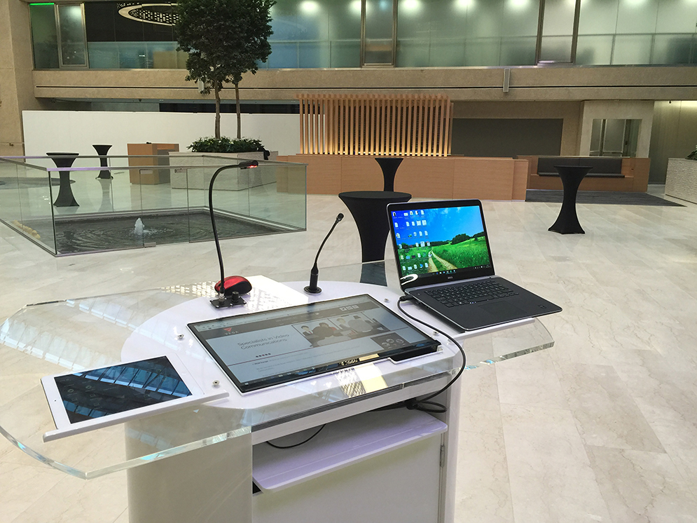 Working with Crestron technology, Vega Europe has created an acrylic lectern modified to be portable. It can be relocated to any space, offering a flexible solution for presentations and events.. This system includes a microphone, a speaker and audio processing equipment, all connected to the Crestron system, allowing it to be used in different applications from basic day-to-day use to large-scale events.