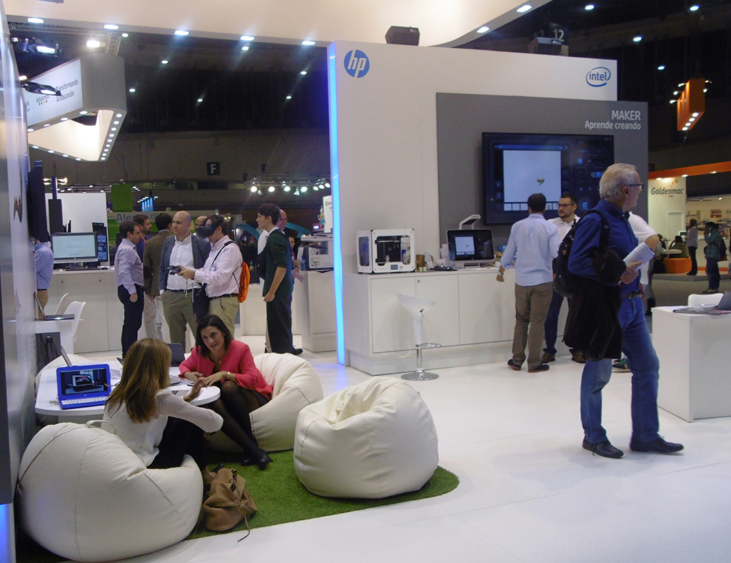 El stand de HP estuvo enfocado a mostrar su concepto Reinvent the Classrom a través de espacios dedicados al alumnado, donde pensar, investigar, diseñar, construir y compartir su aprendizaje; así como zonas polivalentes y dinámicos, que se adaptaban a las necesidades del aula.