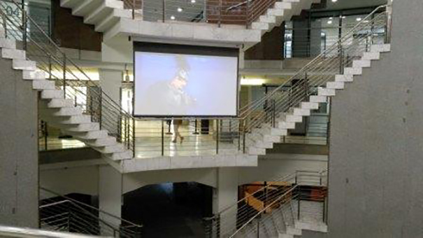 En el hall de entrada se ha instalado un sistema de proyección de alta resolución y luminosidad que proyecta sobre una pantalla motorizada de grandes dimensiones, permitiendo una presentación impactante de contenidos institucionales destinados a los visitantes y alumnos del centro.