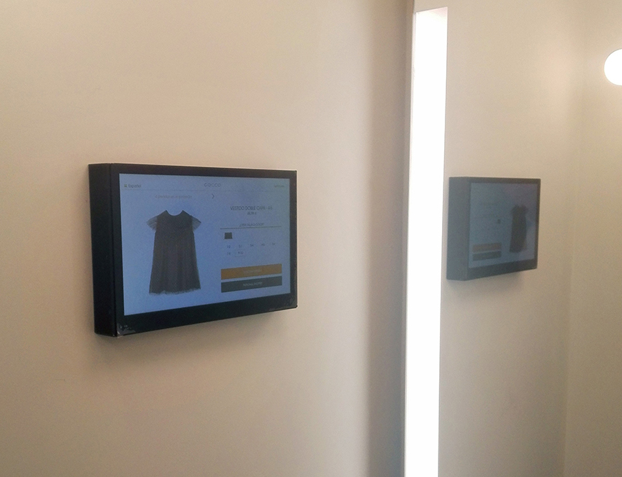 En cuanto a los probadores digitales están compuestos por una pantalla de 15, localizada en la zona de atención y recepción donde el cliente o la dependienta eligen el probador que esté libre y se escanea el código de barras de la etiqueta de la prenda que se va a probar. Besides, el cliente puede solicitar asistencia del personal desde el interior del probador, pedir una talla distinta o consultar el catálogo de colores de la prenda que se está probando. Estas solicitudes de asistencia o tallas desde el interior del probador se trasmiten de forma instantánea al iPod del que disponen las dependientas de tienda.