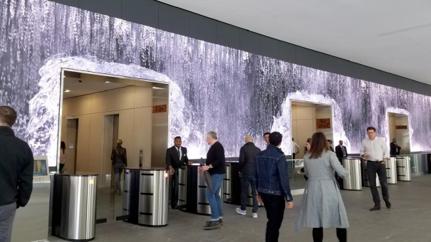 A spectacular 'Led' water waterfall welcomes visitors to the Salesforce building