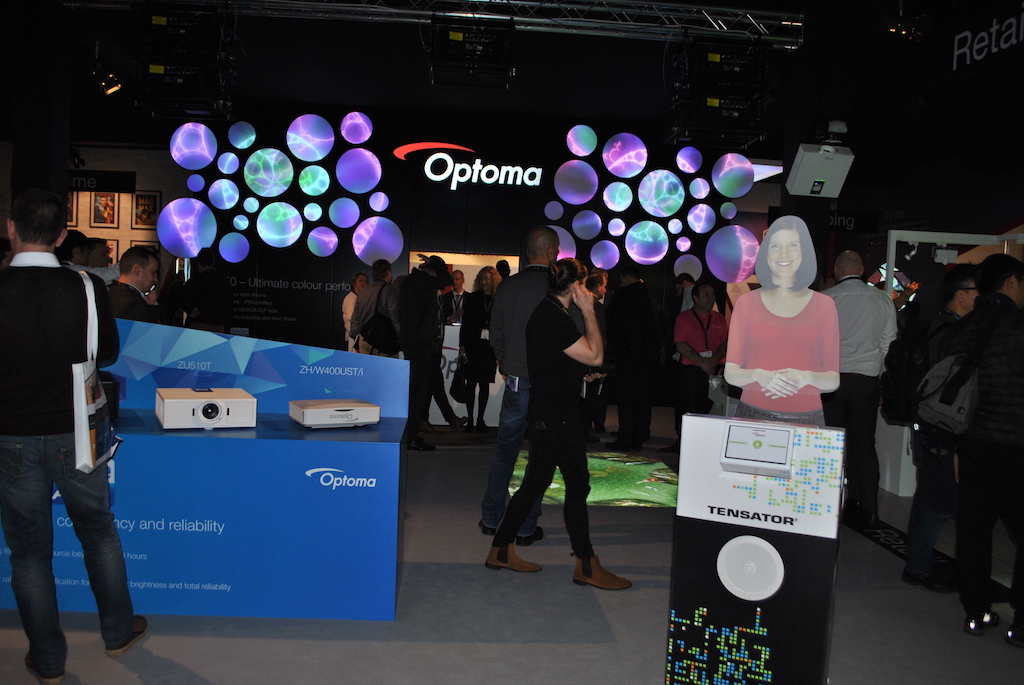 In addition, en esta área también se exhibe una solución de señalización digital de próxima generación de tensioner. Este asistente virtual utiliza la tecnología ALR, junto con un proyector Optoma de proyección ultra corta incorporado en la unidad para mostrar una imagen y crear la ilusión de una persona real, actuando como una herramienta informativa e instructiva interactiva.