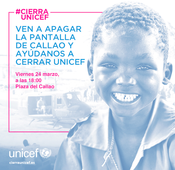 La acción que se iniciará a partir de las 18:00h, promovida por Unicef con la colaboración de Callao City Lights, forma parte de la campaña #cierraUnicef, ideada por J. Walter Thompson, que la organización ha puesto en marcha con el fin de conseguir acabar, de una vez por todas, con las penurias que millones de niños padecen en todo el mundo y así lograr que su labor deje de ser necesaria: “hacer un sueño realidad”, tras sus más de setenta años de actividad.