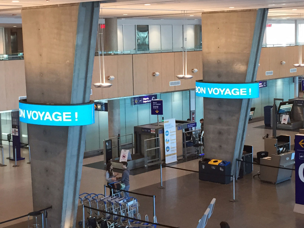 Este es el último proyecto en el que este fabricante ha participado con la compañía de transportes aéreos de Canadá. However, su relación se remonta a tres años atrás cuando realizado la instalación de una pantalla Nixel de doble cara de 6×1,2 metros en la puerta de embarque del aeropuerto más grande de Montreal. Proyecto que fue continuado con la implantación de dos pantallas de 360 grados de la misma línea y unas medidas de 7,3×0,6 meters each, en la puerta de salida transfronteriza (Transborder Departure Gate USA).
