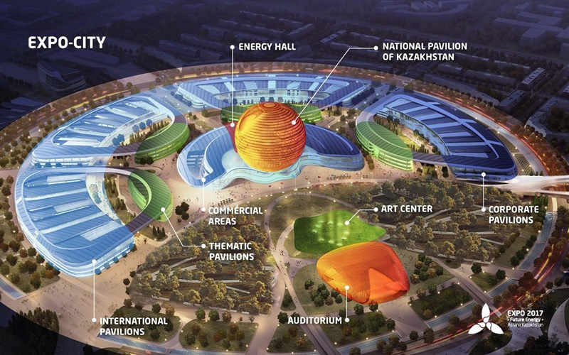 ‘Energía del Futuro’ es el lema de esta exposición y su objetivo es debatir y concienciar sobre el papel de la energía como un activo inherente a la humanidad, que debe ser empleado de manera responsable y eficiente. La superficie total del complejo expositivo ocupa 174 hectares, distribuidas en torno al edificio principal, donde se ubica el Pabellón Nacional de Kazajstán, diseñado con la forma de una esfera de cristal de siete niveles sobre una base de forma orgánica. Cada uno de estos niveles está dedicado a una tecnología diferente para la generación de energía.