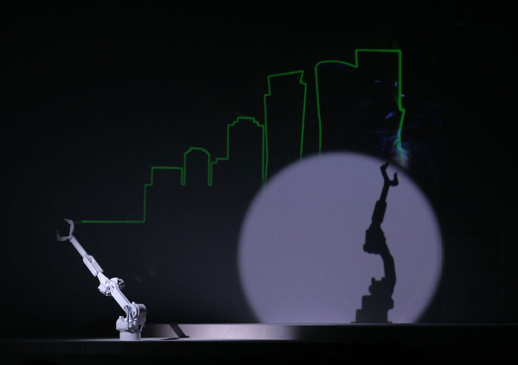 Uno de los momentos destacados en este sentido lo protagonizó PowHand, un brazo robótico de seis ejes antropomorfo que realizó una coreografía con su propia sombra proyectada en la pantalla.