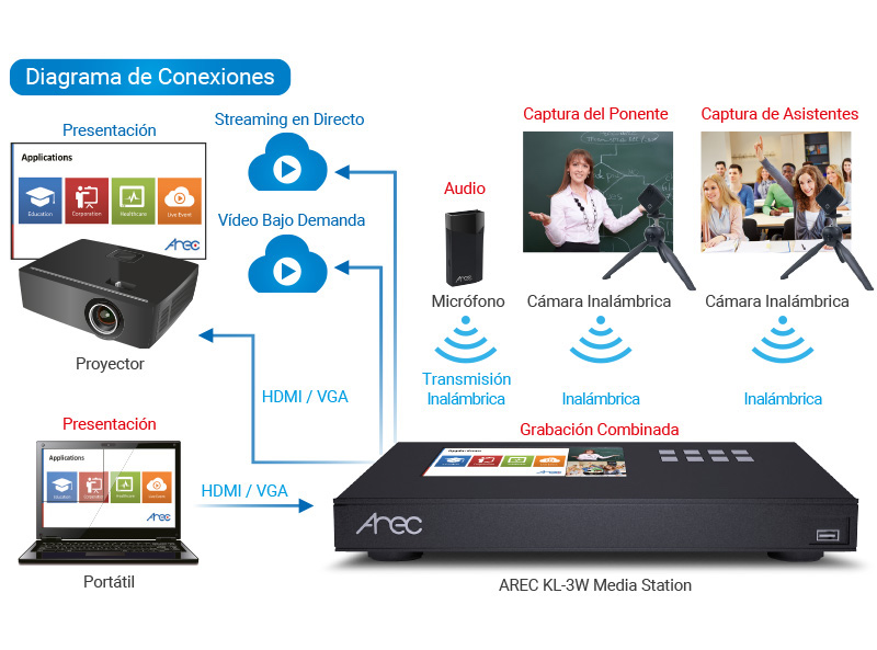 Arec KL-3W admite la captura de hasta tres fuentes de vídeo Full HD a través de HDMI/VGA/RJ45 al mismo tiempo, ya que es compatible con cámaras en red, laptops, PCs y cualquier entrada digital VGA/HDMI donde se esté mostrando algún contenido, como presentaciones o vídeos, y es capaz de crear hasta cuatro vídeos con grabación sincronizada.
