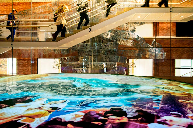 El elemento más icónico del museo es una escultura de 25 meters high, realizada en aluminio y acero, situada en el atrio del edificio y que asciende junto a las escaleras hasta el lucernario, recorriendo así las seis plantas de esta instalación. Con el nombre oficial de Vortex of European History, esta obra es una alegoría sobre “la unión en la diversidad”, y la integran citas literarias que destacan los diferentes idiomas y alfabetos presentes en la UE, mediante una filigrana metálica que conforma la textura gráfica a modo de malla que discurre por el espacio.