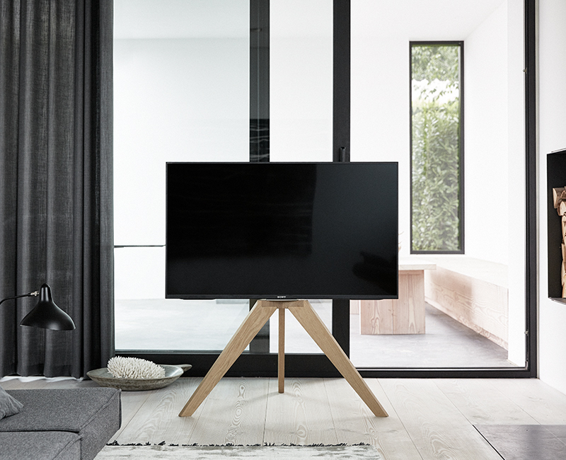 Tal y como pudo verse en IFA 2017, Vogel’s ha colaborado en el diseñador de producto danés Malte Kidde para crear el stand Next OP1, una pieza de mobiliario que simula un trípode para el televisor.