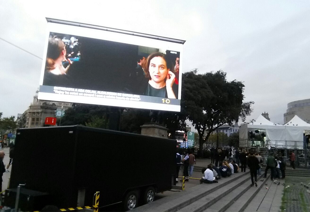 In addition, para dar una mayor difusión a los resultados del referéndum, también se ubicó en la plaza de Cataluña un remolque dotado con una pantalla Led. Both, de exterior, son muy versátiles e idóneas para facilitar la comunicación en eventos multitudinarios.
