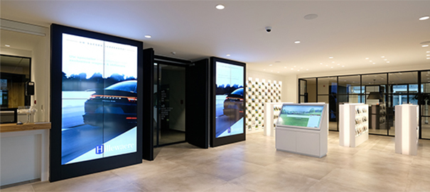 La solución de visualización implantada que buscaba Hillewaere para lograr el impacto visual está configurada por ocho pantallas de bisel super angosto (super narrow bezel) BenQ PL552, cuatro a cada lado de la entrada formado dos videowall.