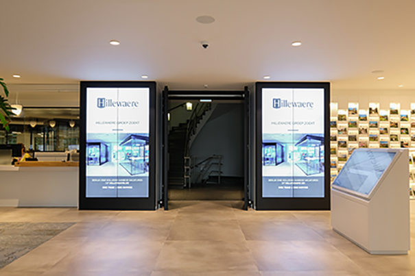 El grupo inmobiliario Hillewaere ha instalado, en su sede de Turnhout, una solución de visualización integrada por dos videowall configurados por ocho pantallas BenQ PL552, cuatro a cada lado de la entrada.