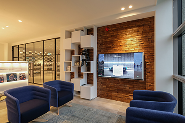 Para rediseñar esta oficina se han instalado dos llamativos videowall en la entrada principal, así como pantallas inteligentes de alta resolución en las salas de reuniones.