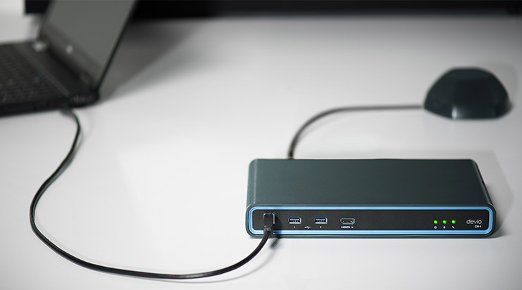 Con el clip de montaje incluido, Devio puede instalarse sobre la mesa o montarse debajo e incluso instalarse detrás de la pantalla. Integra salida de vídeo a pantallas HDMI y ofrece puertos USB para conectarse a otros dispositivos (como una cámara USB) para crear la configuración ideal de la sala de reunión.
